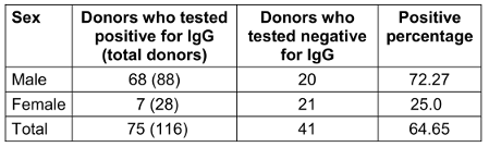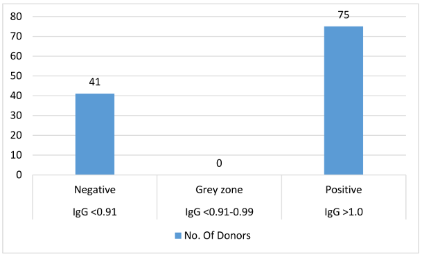 An IgG value of <0.91 is considered negative, showiing a lack of previous exposure to cytomegalovirus. If the values are between 0.91 and 0.99 (inconclusive), re-testing is necessary; titre values >1.0 (positive) mean that the donor has had a history of CMV exposure. When the IgM value is <0.90 (negative), it shows a lack of previous exposure to cytomegalovirus. Values between 0.91 and 1.1 (inconclusive) indicate that re-testing is necessary. Titre values >1.1 (positive) show that the donor has had a history of CMV exposure. Based on these values, 75 of 116 donors showed a higher titre value of IgG and 41 showed negative results for IgG. Also, all 116 samples showed a negative titre for IgM.