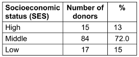 According to the updated Modified Kuppuswamy socioeconomic status scale, our donors were classified as upper, middle, or lower class. The majority of our volunteers (73.0%) were of middle SES, followed by lower SES (14.1%), with the fewest being of SES (13.1%).