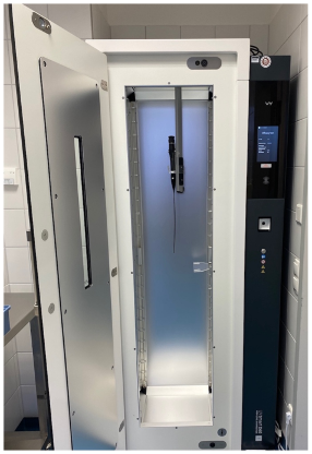 Figure 1: D60 UV disinfection system (UV Smart Technologies B.V., Rijswijk, Netherlands) with a thermolabile flexible otorhinolaryngological endoscope inside, as it is used in clinical routine.