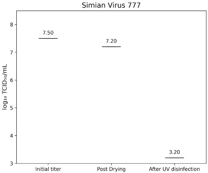 Figure 6: Lg TCID50/mL titers of Simian virus strain 777 on test surfaces at initial inoculation, post-drying, and after UV-C treatment