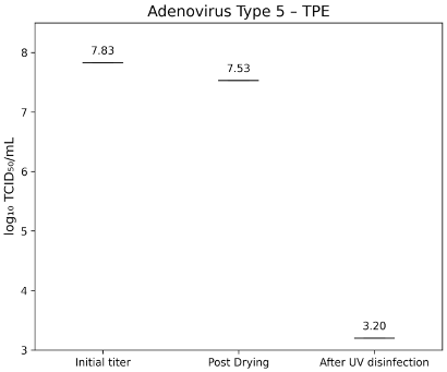 Figure 7: lg TCID50/mL titers of Adenovirus Type 5 on glass test surface at initial inoculation, post-drying, and after UV-C treatment