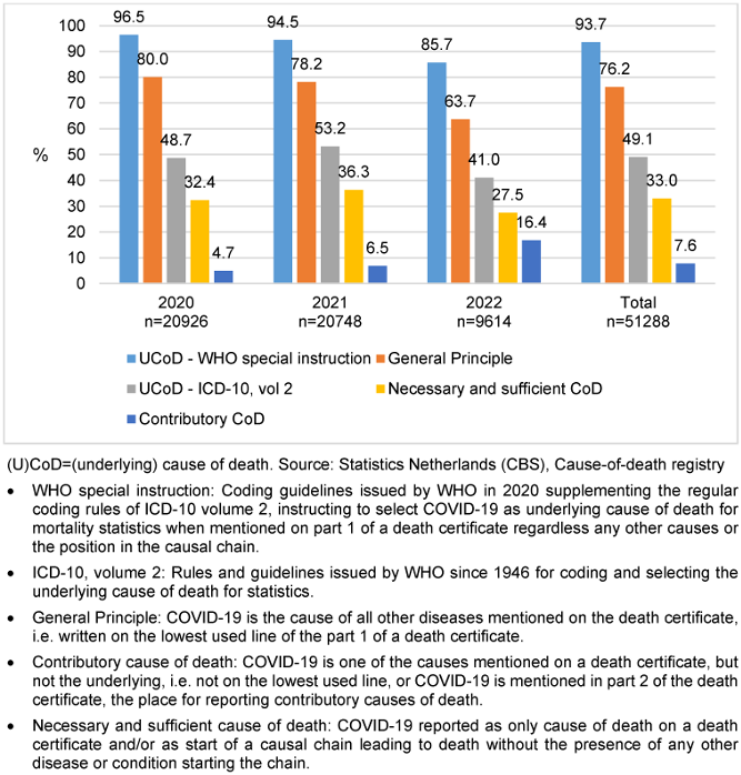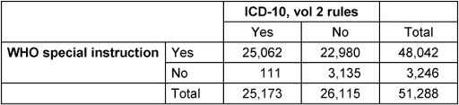Methods: Double (bridge) coding of all death certificates mentioning COVID-19 in the Dutch cause-of-death registry during the pandemic 2020–2022 (n=51,288). The coding of records by the WHO special instruction for COVID-19 as issued in April 2020 was compared with the coding of the same set of records by the prevailing rules of the ICD-10 and the effect on cause-of-death statistics was studied.
