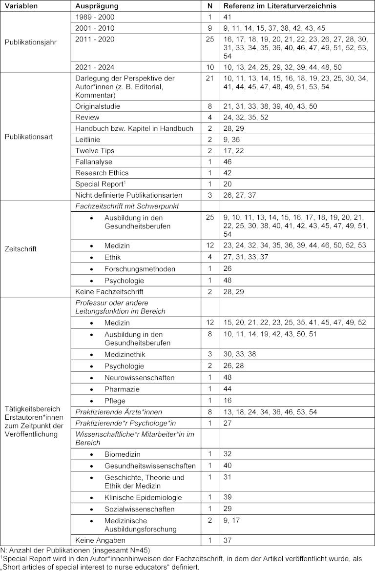 Ausgewählt wurden Publikationen, die ethisch relevante, forschungspraktische Probleme in der Ausbildungsforschung der Gesundheitsberufe thematisieren, deren Erstautor*innen in der Ausbildungsforschung oder angrenzenden Bereichen wie Psychologie oder Ethik/Forschungsethik beschäftigt und die in deutscher oder englischer Sprache verfügbar sind. Bezüglich Publikationstyp, Erscheinungsdatum und Herkunftsland der Publikation gab es keine Einschränkungen.