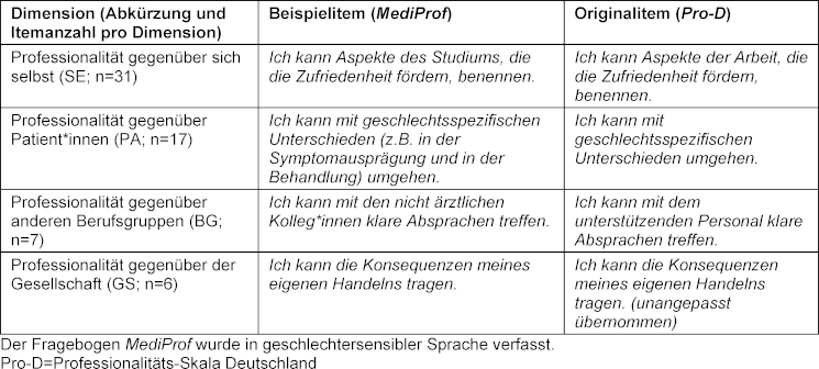 Tabelle 1 [Tab. 1] zeigt die vier Professionalitätsdimensionen aus dem Fragebogen MediProf mit Beispielitems und in Gegenüberstellung zum Fragebogen Pro-D