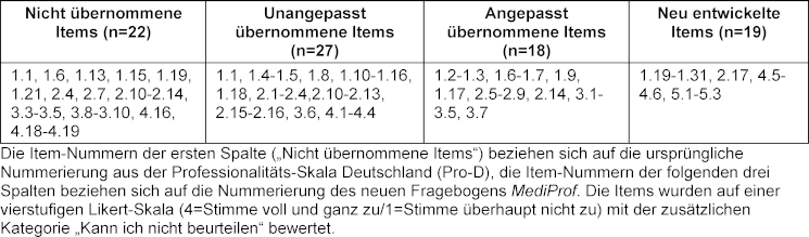 In Anhang 1 [Anh. 1] findet sich der vollständige Fragebogen MediProf. In Anhang 2 [Anh. 2] findet sich eine Übersicht aller Items aus dem Fragebogen MediProf in Gegenüberstellung zu den jeweiligen Items aus der Pro-D sowie Angaben zum Anpassungsprozess (siehe Anhang 2 [Anh. 2], Tabelle A2.1 und Tabelle A2.2).