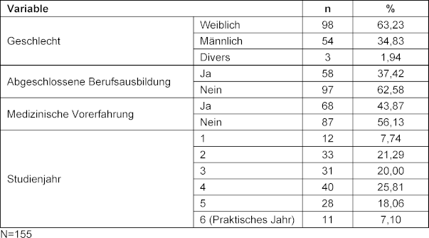Von insgesamt 1.866 angeschriebenen immatrikulierten Medizinstudierenden nahmen 224 Studierende (12%) an der Befragung teil. Als Grundlage für die weiteren Auswertungen wurden die Fragebogendaten von N=155 Studierenden verwendet, die neben den soziodemografischen Angaben die Items aller vier Dimensionen vollständig beantwortet haben. In dieser Stichprobe liegt der Anteil an fehlenden Itemwerten (sog. „Missing Values“) durch die Wahl der Antwort „Kann ich nicht beurteilen“ pro Dimension unter 10% (Dimension 1: 1,3%; Dimension 2: 4,7%; Dimension 3: 4,9%; Dimension 4: 8,6%). Das Durchschnittsalter der Teilnehmenden lag bei 25,39 Jahren (SD=5,83). In Tabelle 3 [Tab. 3] sind die soziodemografischen Angaben der Teilnehmenden dargestellt.