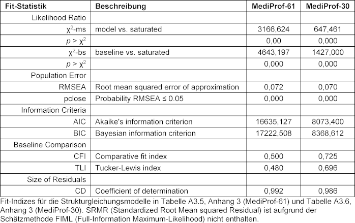 Die Ergebnisse aus der CFA spiegeln den ebenfalls unzureichenden Fit, den Roos et al. [19] mit einer kleinen Stichprobe und >60 Items gefunden haben. Analog zu dieser Studie präsentiert Tabelle A3.6 im Anhang 3 [Anh. 3] ebenfalls eine CFA mit einer deutlich reduzierten Item-Zahl. Die Auswahl wurde nicht qualitativ getroffen, sondern orientiert sich an den psychometrischen Eigenschaften (siehe Anhang 3 [Anh. 3]): Items wurden entfernt, wenn die Trennschärfe <0,3 und/oder die Itemschwierigkeit >0,8 ist. Tabelle A3.6 in Anhang 3 [Anh. 3] zeigt in der CFA mit 30 verbliebenen Items insgesamt höhere standardisierte Ladungen auf; die Assoziationen zwischen den latenten Faktoren sind nach wie vor ausgeprägt. Wie bei Roos et al. [19] verbessern sich die Fit-Indizes mit der reduzierten Item-Zahl leicht („MediProf-30“, siehe Tabelle 4 [Tab. 4]), ohne jedoch Kriterien für einen akzeptablen bis guten Modell-Fit zu erfüllen.