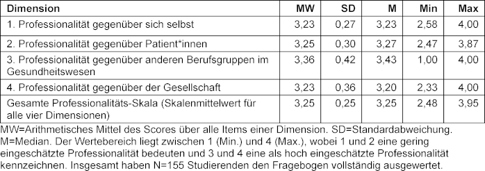 Die höchste Selbsteinschätzung zeigte sich in Dimension 3 („Professionalität ggü. anderen Berufsgruppen im Gesundheitswesen“), die signifikant höher bewertet wurde als die anderen Dimensionen (p<0,05).