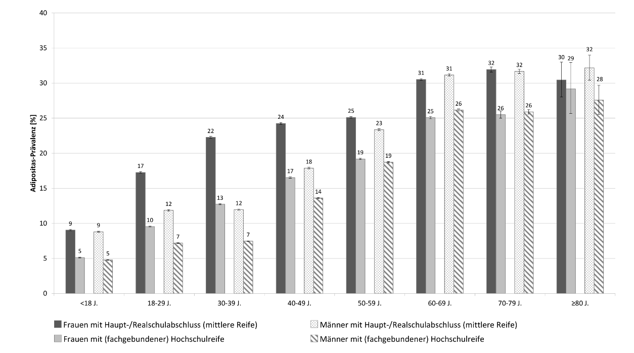 Ergänzend zu den Auswertungen basierend auf GePaRD wurden die im Rahmen der GEDA-2014/2015-Befragung des RKI erhobenen Primärdaten vergleichend ausgewertet [15], d.h. es wurde auch die Adipositas-Prävalenz nach Alter, Geschlecht und Schulbildung (in den Kategorien (Fach-)Abitur, mittlere Reife und Hauptschulabschluss) ermittelt. An der Befragung, die mittels elektronischer Fragebögen oder Telefoninterviews durchgeführt wurde, nahmen 24.016 Personen ab 18 Jahren mit Hauptwohnsitz in Deutschland teil [16].
