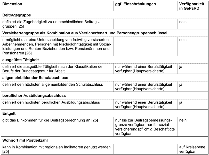 Ausgangspunkt war eine Variable, die in den Versichertenstammdaten enthalten ist und Informationen zum Beruf, zur beruflichen Stellung und zur Ausbildung enthält. Diese Informationen, die mit dem Begriff „Tätigkeitsschlüssel“ zusammengefasst werden, werden von den Arbeitgebenden gemäß §28a Sozialgesetzbuch (SGB) IV an die Sozialversicherungsträger für alle versicherungspflichtigen und freiwilligen Hauptversicherten mindestens jährlich übermittelt. Dementsprechend steht die Information unter anderem nicht für Personen zur Verfügung, die in dem jeweiligen Jahr bereits in Rente sind, sowie für sonstige Versicherte und Familienversicherte [11].