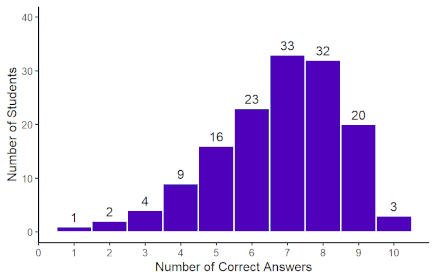 Students achieved a median score of 7 out of 10 questions correctly (mean = 6.77, SD=1.78, range: 1–10, interquartile range: 6–8), which is statistically different from randomly selecting one of five possible answers (probability for success: 0.7, 95% CI: 0.35–0.93, p<0.001). Students in the 5th semester showed a median of 7 of 10 correct answers (mean = 6.83, SD=1.74, range: 1–10, interquartile interval: 6–8), and students in higher semesters (n=13, 7 in the 6th, 2 in the 8th, and one in the 7th, 9th, 10th, and 23rd semester) answered a median of 6 out of 10 questions correctly (mean = 6.15, SD=2.15, range: 2–9, interquartile range: 5–7). Difference in total points were not statistically significant (Wilcoxon rank sum test, p=0.243).