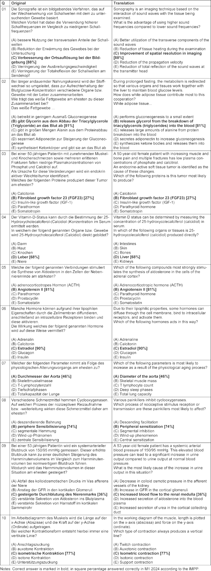 An anonymized survey was conducted among medical students at the medical faculty of the Justus-Liebig-University Gießen who were already in the clinical stage of their studies. In a typical semester around 170–180 students are enrolled. The survey required medical students to answer a random selection of single-choice examination questions familiar to them from their own state examination from the previous year in 2024 (first section of the German medical examination “M1”). Questions were selected by the authors from a pre-filtered pool based on clinical relevance (reference to diagnostics: Q01, 10, case studies: Q03, 07, 09 or diseases: Q02, 04, 05, 06, 08), moderate difficulty (according to Institut für medizinische und pharmazeutische Prüfungsfragen (IMPP) [20], the average correct answer rate for the set of questions Q01–10 was 66.8% [Min. correct answer rate 27% for Q03 and max. 90% for Q06]), and exclusion of chemical and mathematical content to focus on clinically applicable medical knowledge, which has been taught at least up to the M1 level (see Table 1 [Tab. 1] for complete question set with translations). Students were surveyed during their clinical phase, creating temporal distance from their active examination preparation period.