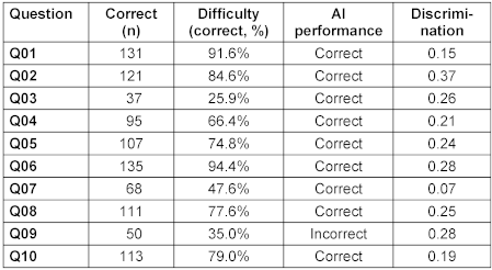 The analysis of individual questions revealed considerable variation in difficulty and discriminative power (Table 2 [Tab. 2]). The questions ranged from very easy (Q01: 91.6% correct) to very difficult (Q03: 25.9% correct). Notably, the question that all LLMs answered incorrectly (Q09) had moderate difficulty (35% student success rate) and showed the second highest, though still marginal discrimination (0.28), indicating that it was one of the more effective questions at differentiating between higher and lower-performing students.