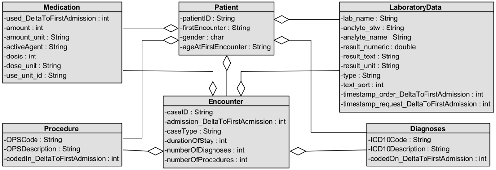 The information model for the data provided is given in Figure 2 [Fig. 2]. Due to data anonymization, the original dates for all clinically relevant data were exchanged with the difference in days to the date of the first encounter. As reference, the age at the first encounter and the timeframe of this encounter was given for each patient.