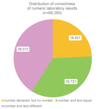 Accuracy is understood as the measure to express whether “data are correct, reliable and certified free of error” [22]. As the original data and exported data cannot be compared in this study, the accuracy within our study focused on laboratory data. Stated data types were tested, and whenever different representations of the same result within one entry were provided, we tested whether these representations were congruent. If string and numeric values differed, a physician determined the most plausible value. Additionally, the consistent spelling of units was verified.