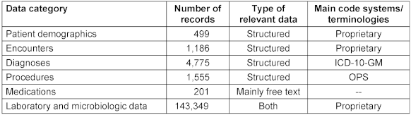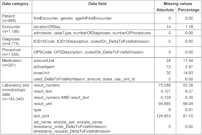 We received data on 499 patients and 1,186 encounters, comprising a total of 4,775 diagnosis entries, 1,555 procedure entries, 201 medication entries, and 143,349 laboratory entries, as shown in Table 1 [Tab. 1]. Except for medication, relevant data were available in a structured way.