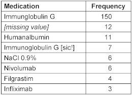 Medications were not stored as structured data, only the active ingredients had been recorded as free text. The eight most frequently documented medications are shown in Table 5 [Tab. 5], all other medications had a frequency of 1. Only for 21 out of 499 patients (4.2%) and 43 out of 1,186 encounters (3.6%), medication data were available. In 12 out of the 201 medication records, the active_agent was missing. Whether this was due to the anonymization process or because of the data in the DWH could not be determined. Also, the dataset did not include the patients’ long-term medication, but predominantly billing-relevant medication, mostly intravenously applied medication, such as immunotherapies. Medications that are taken orally were not included.