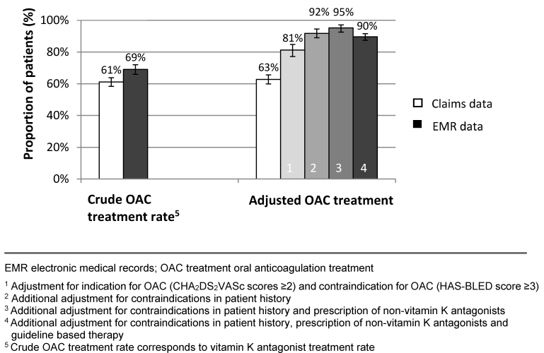 Results: We identified 927 patients based on EMR and 1,247 patients based on claims data. The crude total OAC treatment rate was 69% based on EMR and 61% based on claims data. The adjusted OAC treatment rates were 90% for patients based on EMR and 63% based on claims data. 82% of the AF patients received a treatment for rate control and 12% a treatment for rhythm control. The most common reasons for non-prescription of OAC were an increased risk of falling, dementia and increased bleeding risk.