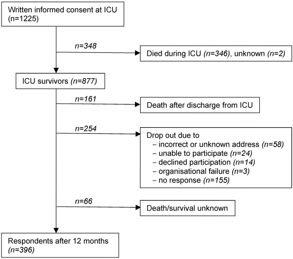 Written informed consent was obtained for 1,225 ARDS patients from 61 ICUs, of these 28.2% (346 patients) died in the ICU, thus the post-ICU survivor DACAPO cohort comprised 877 patients, of which 481 patients (54.8%) could not be followed (death, incorrect address, inability to participate, unknown reasons (Figure 1 [Fig. 1])). 396 patients were successfully followed up to 12 months.