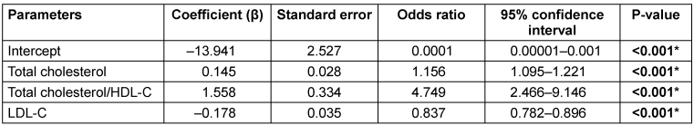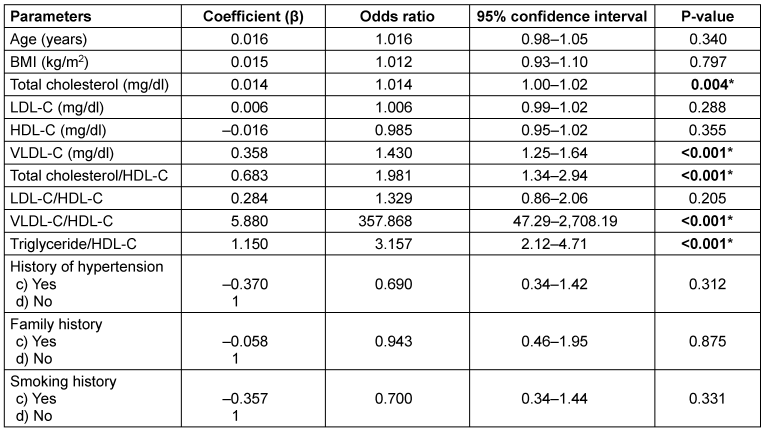 Table 2 [Tab. 2] presents the results of the univariate analysis used to identify potential parameters associated with low and elevated TyG index groups for the binary logistic regression model. Among the parameters analysed, TC, VLDL-C, TC/HDL-C ratio, VLDL-C/HDL-C ratio, and TG/HDL-C ratio showed statistical significance (P≤0.05*). Conversely, age, BMI, LDL-C, HDL-C, LDL-C/HDL-C ratio, history of hypertension, family history, and smoking history did not exhibit statistically significant differences (P>0.05).