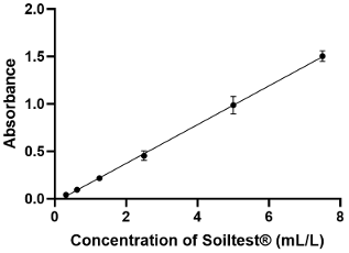 Figure 2: Calibration curve of Soiltest®’s volumes at 570 nm. Calibration ranges were repeated 5 times, all points were performed in duplicate. On the graph, all points are represented as mean ± standard deviation