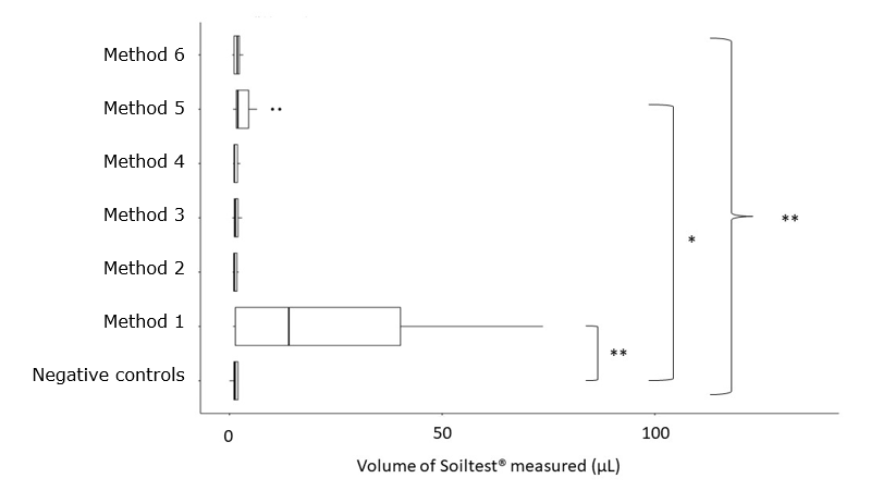 A Kruskal-Wallis test was used to compare the Soiltest® volumes measured with the different washing methods. Dunn’s test was performed in cases of significant differences between groups identified by the Kruskal-Wallis test, to compare each method with the negative controls.