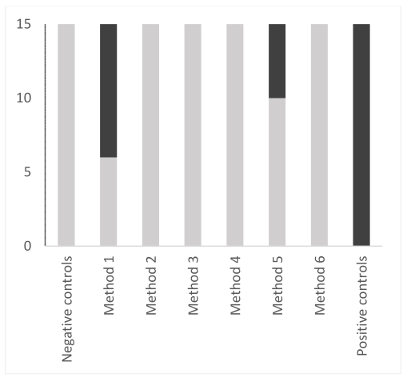 Figure 4: Comparison of 6 washing methods of reamers using a qualitative statistical approach. The positivity limit was determined from the mean of values of negative controls (mean+3 standard deviation). Negative samples are shown in light grey. Positive samples are shown in dark grey.