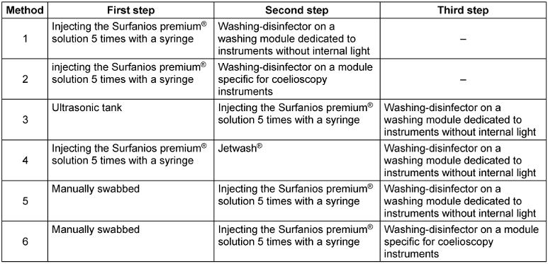 Instruments were soaked for 20 minutes in an ultrasonic tank filled with Surfanios premium® solution, without a hollow-body irrigation system, and rinsed by injecting the Surfanios premium® solution 5 times with a syringe and then placed on a washing module dedicated to instruments without internal light (DS 1000-P-001). The same washing process as in method 1 was then carried out.