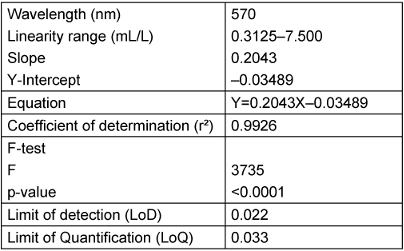 The proposed method was successful in quantifying Soiltest® with a linear method based on spectrophotometry at an absorbance at 570 nm (Figure 2 [Fig. 2]). The equation was Y=0.2043X–0.03489 with a coefficient of determination of 0.9926. The slope was significantly different from zero, with a p-value <0.0001 (F-test). LoD was 0.022 and LoQ was 0.033 (Table 2 [Tab. 2]).