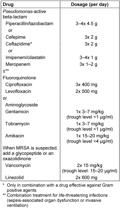 In addition to the previously mentioned common pathogens, in this group of patients Enterobacter spp., Serratia spp., Citrobacter spp. and Pseudomonas, Acinetobacter spp., Stenotrophomonas maltophilia and anaerobes may be encountered. For treatment, therefore, antibiotics should be used that cover these pathogens in their spectrum. The choice is therefore acylaminopenicillins/ beta-lactamase inhibitor (BLI) or Pseudomonas-effective carbapenems or cephalosporins, respectively. In patients with life-threatening infection (sepsis-associated organ dysfunction or invasive mechanical ventilation), initial treatment should be combined with a Pseudomonas-active fluoroquinolone or an aminoglycoside to increase the coverage (see Table 11[Tab. 11]). Ceftazidime should only be used in combination, because of its insufficient efficacy against Gram-positive cocci.