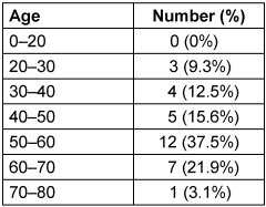 Our cohort had 32 patients (n=32). All patients were male (n=32; 100%). The age distribution is shown in Table 1 [Tab. 1]. There were no patients under the age of 20. The cohort of highest age was between 50 and 60 years old with 12 patients (n=12; 37.5%).