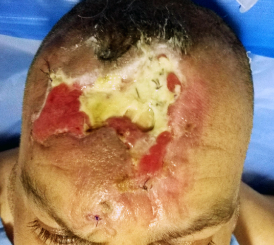 Figure 1: The defect in the central area of the forehead with signs of previous repair associated with bone exposure