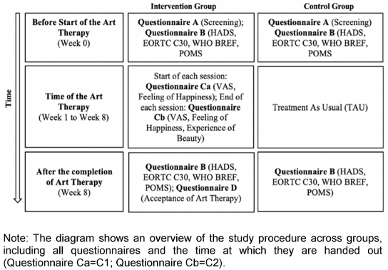 The patients of the intervention and control group received Questionnaire B at two points in time: (1) before starting art therapy, and (2) after eight weeks of art therapy or TAU, respectively (see Figure 1 [Fig. 1]). The questionnaire contained four standardized surveys (HADS, POMS, EORTC C-30 & WHO BREF) that measured the main variables of the study, anxiety, depression, and quality of life. Anxiety and depression were assessed by the German version of the Hospital Anxiety and Depression Scale (HADS) [19]. Quality of life was assessed by three surveys. The German short version of the Profile of Mood States (POMS) [32]), the Core Quality of Life Questionnaire of the European Organization for Research and Treatment of Cancer (EORTC QLQ-C30) [35] and the WHOQOL BREF [8] from the World Health Organization Quality of Life group [44], [45]. The questionnaires assess various aspects of health-related quality of life. In this feasibility study, it was important to assess which of the QoL measures is most suited and effective in this context.