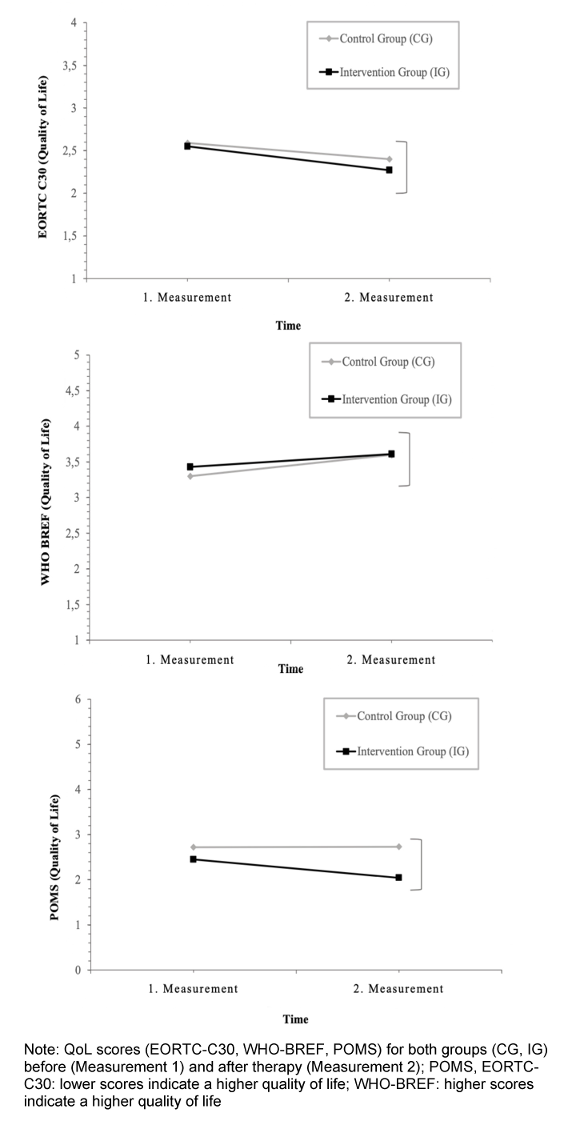 Descriptive values (M, SDs, and DSs) of the different quality of life measurement scores before (Measurement 1) and after (Measurement 2) the intervention for both groups are displayed in Table 1 . No significant differences were found for the baseline measures of the three QoL questionnaires (EORTC: p=.818; WHO: p=.631; POMS: p=.630). For the EORTC C30, a lower score indicates a higher quality of life (1=not at all; 4=a lot). Individuals in the intervention group (DS=–.28) showed a higher QoL increase than those in the control group (DS=–.18).