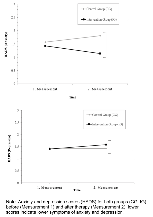 Descriptive values (means, standard deviations, and difference scores) of the HADS for both groups before (Measurement 1) and after (Measurement 2) the eight weeks of treatment, and the difference scores (DS) for each value, are displayed in Table 1 [Tab. 1]. Means were calculated for each subscale (seven items each). Higher values exemplify stronger expressions of anxiety and depression (0=not at all; 3=nearly every day). Mann-Whitney-U-Tests were applied to check the baseline measures of both anxiety, and depression. Neither the scores for anxiety (p=.699), nor for depression (p=.936) were significantly different between the two groups.