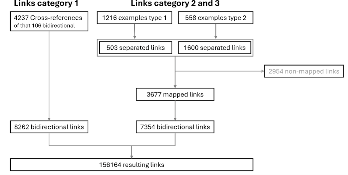 For step 1, an analysis was performed of the CR available for all three reference categories. Since some CR in reference category 1 in NKLM 1.0 had been created in only one direction (unidirectional) and others bidirectionally (i.e., the same CR existed twice), all CR were created bidirectionally for the analysis in order to standardize them. In addition, the number of free texts that could not be converted into CR was determined. Subsequently, the absolute number of bidirectional CR before and after mapping was determined and visualized for all chapters using cross tables.