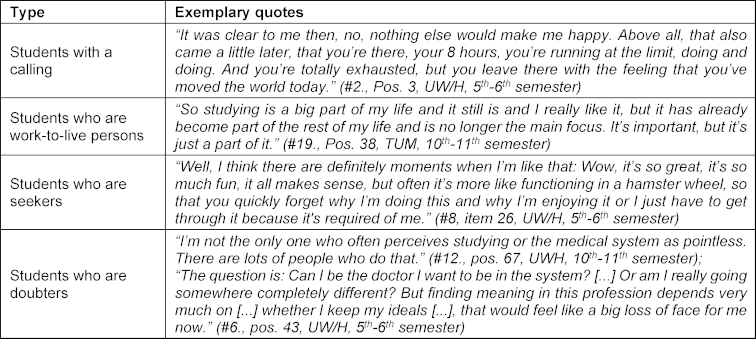 The students reported that experiences of meaningfulness and crises of meaning had an impact on their motivation. Four specific student-types were elaborated, regarding the degree of motivation for their studies and later career entry, in professional meaningfulness and crises: Students with a calling had the strongest motivation and the highest experience of meaningfulness with hardly any crises of meaning. Students who are seekers had a high experience of meaningfulness, but their motivation was low due to crises of meaning, in contrast to students who are doubters, who also had a low experience of meaningfulness. Students who are work-to-live persons, despite low levels of experience of meaningfulness or crises of meaning, showed motivation for their studies and later careers.