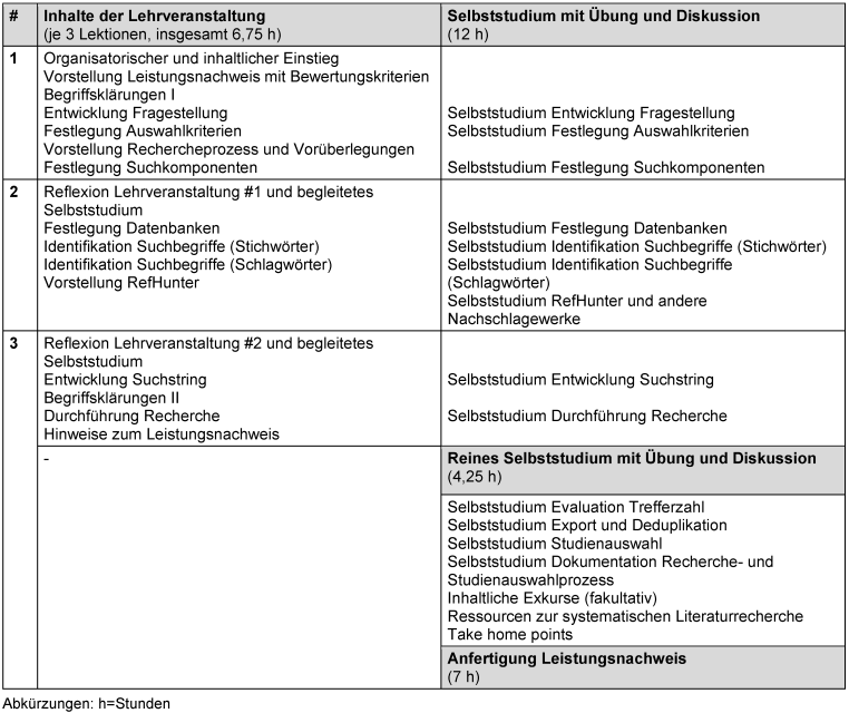 Für diesen Kurs wurden ausgewählte Schritte aus RefHunter entnommen. Dazu zählen die Bestimmung des Themas, die Entwicklung der Fragestellung, die Festlegung der Auswahlkriterien, die Festlegung der Suchkomponenten, die Festlegung der zu durchsuchenden Datenbanken, die Identifikation von Suchbegriffen (Stich- und Schlagwörter), die Entwicklung des Suchstrings, die Durchführung der Recherche und die Dokumentation der Recherche. RefHunter enthält keine methodischen Empfehlungen, welche über die Durchführung und Dokumentation der Recherche hinausgehen. Da die Evaluation der Trefferzahl, der Export und die Deduplikation der Treffer, die Studienauswahl sowie deren Dokumentation jedoch wichtige Schritte für die Studierenden sind, um die Lernergebnisse zu erreichen, haben wir diese Schritte hinzugefügt und inhaltlich ausgearbeitet. Der inhaltliche Teil, der über die Durchführung und Dokumentation der Recherche hinausgeht, findet ausschließlich im begleiteten Selbststudium mit in Moodle bereitgestellten Übungen und Diskussionen statt. Die Schrittabfolge inklusive Beschreibung der einzelnen Schritte ist Tabelle 1 [Tab. 1] zu entnehmen.