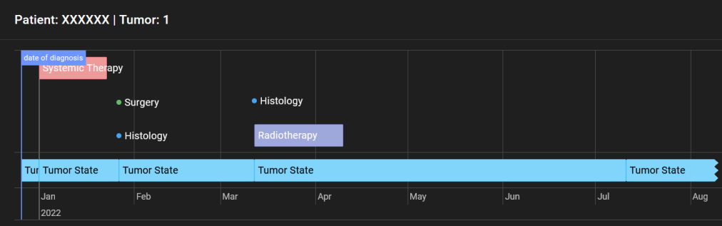 Another important aspect in the development of the application is the visualization of the results of a query. The prototype provides an overview of some important characteristics of the queried cohort. For example, the age and sex distribution, as well as survival times are visualized as diagrams. In addition, an overview of the treatment pathways is presented in the form of a Sankey plot. The software also provides a detailed view for examining individual tumors, displaying the best-of data available for each tumor. A timeline visualizes the course of treatment (refer to Figure 5 [Fig. 5]), and the properties of each treatment can be displayed.