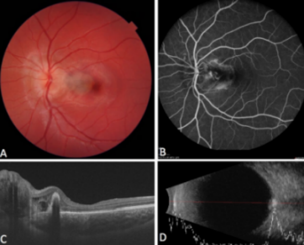 Figure 1: A) Funduscopy revealed a prominent and blurry optic disc with subretinal hemorrhage spreading towards the edge of the macula region; B) CNVM made visible through mid-phase IVFA; C) OCT scan with ODD and parapapillary cystoid edema, subretinal scarring; D) Shallow but prominent ODD are revealed through hyperreflectivity in low-gain mode using ultrasound.