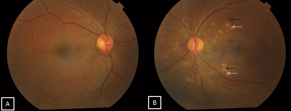 Figure 2: A) Normal fundus of the right eye. B) Fundus of the left eye showing multiple cotton wool spots (white arrows) with superficial retinal hemorrhages (black arrows) on the posterior pole.