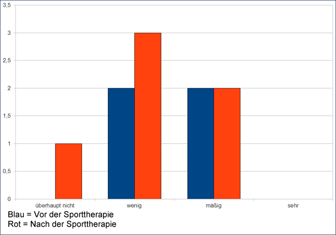 Die Erklärung hierfür mag in dem sehr kleinen Patientenkollektiv, welches wir überschauen, liegen. Darüber hinaus finden sich aber auch Publikationen wie z.B. von Markes et al. 2006 [9], die einen positiven Effekt von Sport auf eine Fatigue-Symptomatik nicht nachweisen konnten.