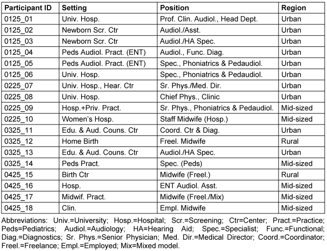 As part of the research project, n=18 semi-structured qualitative expert interviews are being conducted from December 2024 until approximately April 2025. The sampling is based on the concept of theoretical saturation [3]. Recruitment was based on a systematically developed sampling matrix with the aim of achieving a heterogeneous sample from different obstetric care settings (inpatient, outpatient, out-of-hospital) in the federal state of Lower Saxony. The professionals involved in the process of newborn hearing screening will be recruited, including midwives in the clinical-inpatient setting in the delivery room, midwives working in out-of-hospital obstetrics, midwives with a focus on postpartum care, specialists with a focus on gynaecology, medical assistants, nurses, medical-technical staff, audiologists, ENT audiology assistants. The composition of the sample is illustrated in Table 1 [Tab. 1].